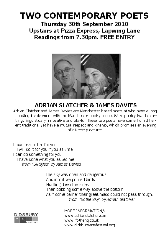 Adrian Slatcher and James Davies reading, 30th September 0 September 21, 2010 Written by ifpthenq Share this: Click to share on Facebook (Opens in new window) Facebook Click to share on X (Opens in new window) X Like Loading... Related