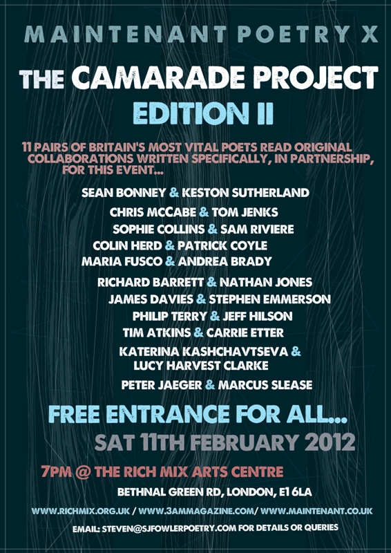 Camarade Edition II 0 January 29, 2012 Written by ifpthenq The night includes if p then q authors Tim Atkins, Lucy Harvest Clarke, Tom Jenks and future author Philip Terry Share this: Click to share on Facebook (Opens in new window) Facebook Click to share on X (Opens in new window) X Like Loading... Related