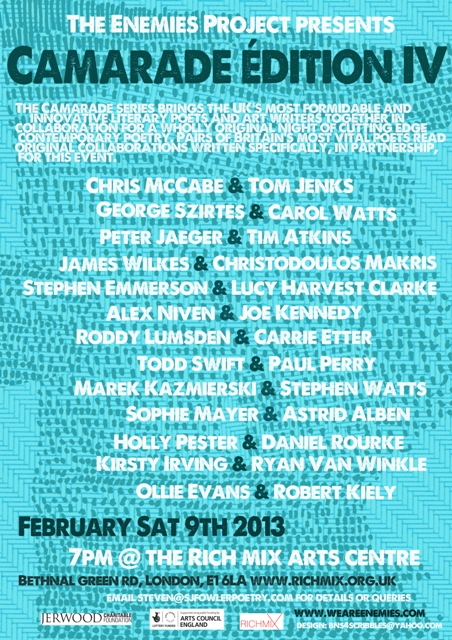 Camarade IV 0 February 4, 2013 Written by ifpthenq if p then q authors Tim Atkins, Lucy Harvest Clarke, Tom Jenks and Holly Pester all read this Saturday at Camarade IV. Share this: Click to share on Facebook (Opens in new window) Facebook Click to share on X (Opens in new window) X Like Loading... Related