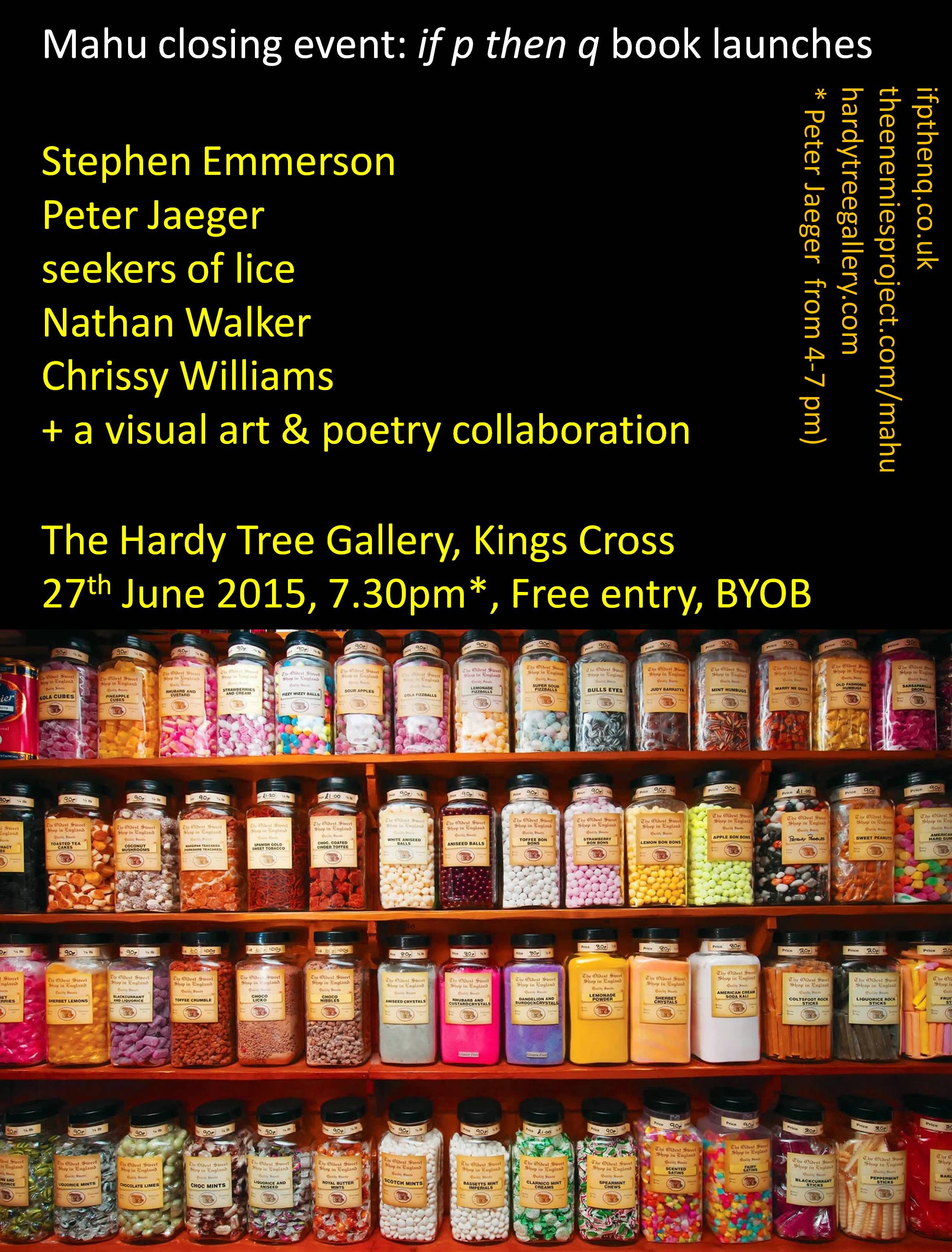 if p then q is an experimental poetry press which has been publishing cutting edge work since 2008. This event is a chance to both launch the latest crop of if p then q titles and celebrate the final night of Steven Fowler’s Mahu exhibition at The Hardy Tree Gallery. As well as performances by Nathan Walker, Chrissy Williams, Stephen Emmerson and seekers of lice, the event will feature a special, not to be missed, 3 hour performance by Peter Jaeger, as well as a collaborative art workshop with artist and director of The Hardy Tree, Amelie Russell.